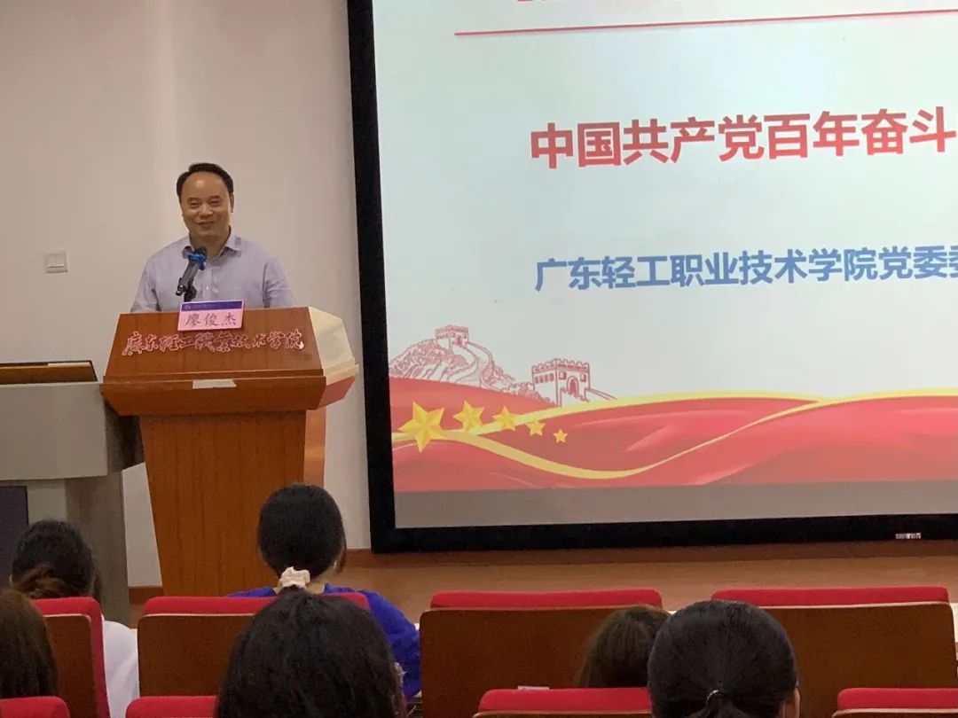 3月11日下午,在广州新港校区第一实训楼105教室,学校党委委员、副校长廖俊杰以“中国共产党百年奋斗的历史意义”为主题,为营销203班和注师201班同学讲授了新学期“思政第一课”。