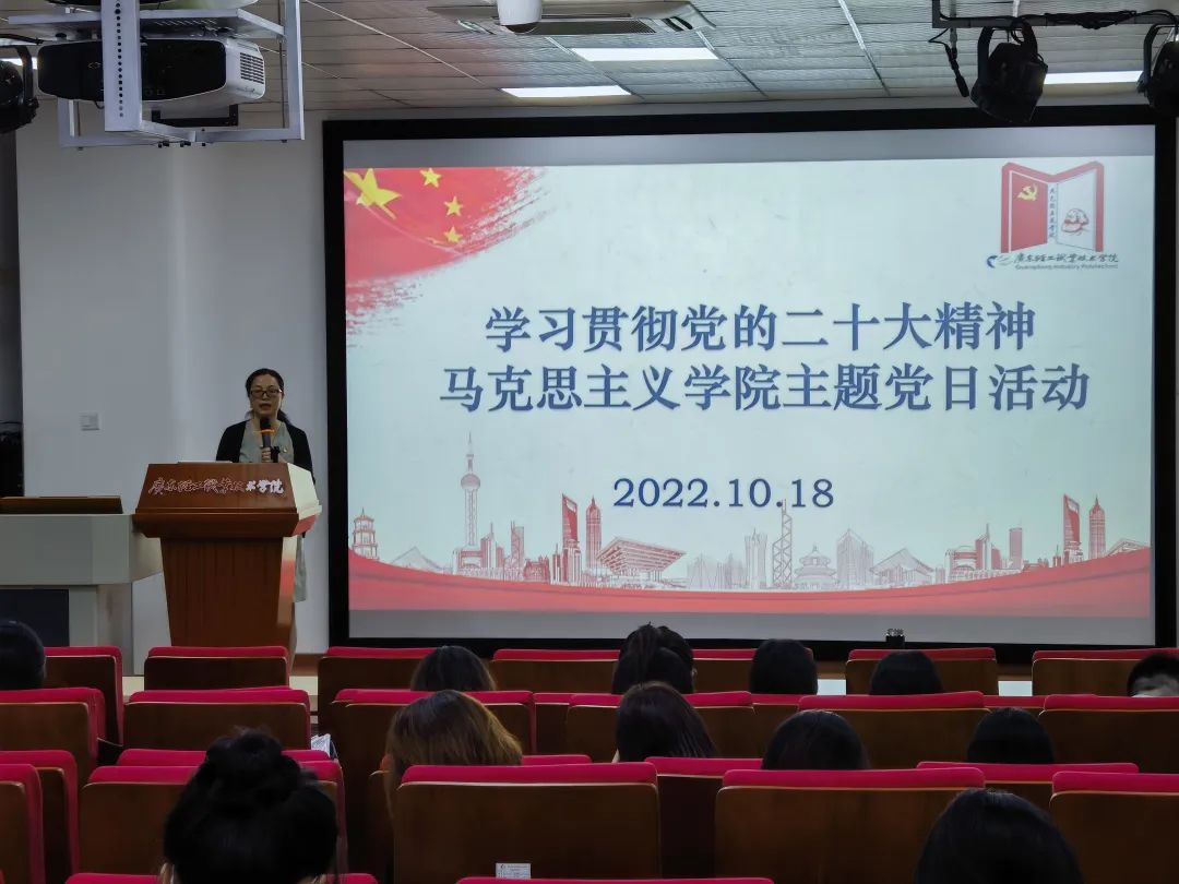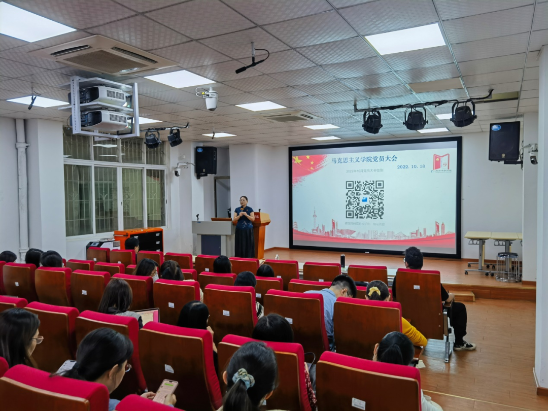 余展洪首先领学了党的二十大精神。她指出,党的二十大特别提到了要弘扬伟大建党精神,提出了要不断的勇毅前行,为全面推进中华民族伟大复兴而团结奋斗。强调我们伟大的国家,伟大的民族,伟大的人民,要做的伟大的事业,大家一定要团结一心才能够取得共同的胜利。她表示,思政课作为宣讲党的二十大精神的主渠道、主阵地,马院教师应更好地承担起这些光荣使命。她希望马院全体教师要认真地把党的二十大精神贯彻到思政课建设、马克思主义中国化研究中,更好地引领我们学院不断地创新发展。最后,余展洪指出,学习党的二十大精神要全面务实、提质增效,不但要做到进头脑,还有要进课堂,进研究领域,进宣讲。最后再次强调全体党员教师要严格落实疫情防控制度要求,严明学院会风会纪,遵守工作纪律、政治纪律和学习纪律。