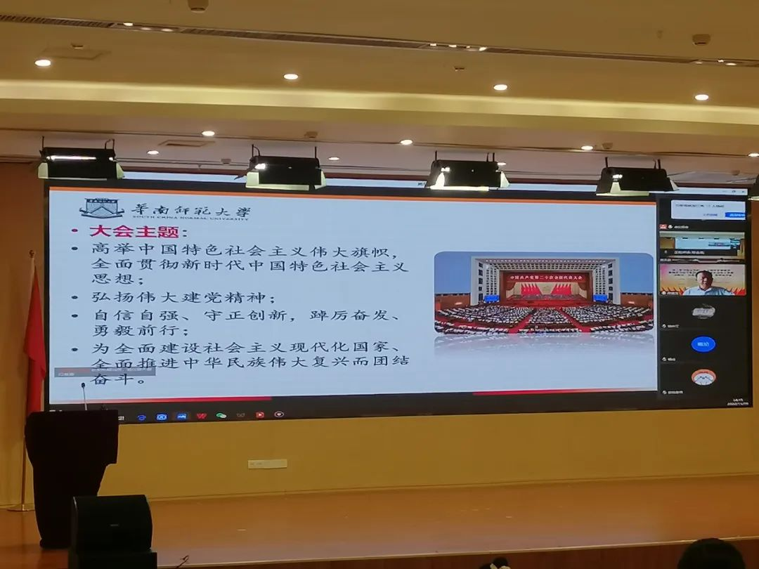 会议邀请教育部奖励计划特聘教授、华南师范大学马克思主义学院院长陈金龙作党的二十大精神宣讲报告。陈金龙从深刻认识党的二十大的主题、深刻认识党的二十大的主要成果、深刻认识过去五年和新时代十年的伟大变革、深刻认识习近平新时代中国特色社会主义思想开辟马克思主义中国化时代化新境界、深刻认识中国式现代化的新论断、深刻认识坚持党的全面领导和全面从严治党、深刻认识前进道路上的风险挑战等七个方面,做了精彩宣讲。陈金龙的宣讲报告政治站位高,理论功底强,对帮助思政课教师全面、深入、系统、准确地理解和掌握党的二十大精神具有重要作用。袁本新主持了宣讲。