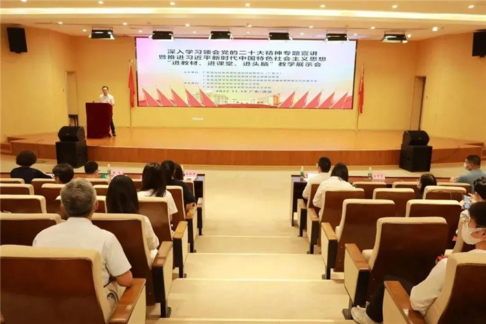 为深入学习领会贯彻落实党的二十大精神,推动大会精神融入高校思政课,进一步提升全省高职高专院校思政课教师教学技能与专业素养,推动高职高专院校思政课高质量发展, 11月19日,由广东省高校思政课区域协同创新中心(广东轻工职业技术学院)、广东省高职高专院校思想政治理论课建设联盟主办,广东财贸职业技术学院马克思主义学院、广东农工商职业技术学院马克思主义学院承办的“深入学习领会党的二十大精神 推进习近平新时代中国特色社会主义思想‘进教材、进课堂、进头脑’”教学展示会成功举办。广东财贸职业技术学院党委书记袁本新,广东省高校思政课区域协同创新中心副主任委员、广东省高职高专院校思想政治理论课建设联盟理事会副会长、广东轻工职业技术学院党委副书记梁艳珍出席会议并讲话。会议采取线上与线下相结合的形式举办,来自全省90所高职高专院校的思政课教师2000多人参加了会议。