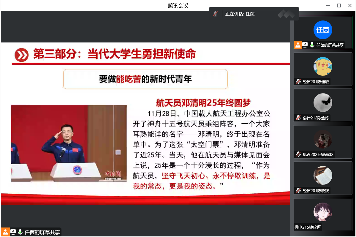 与会同学纷纷发表自己的学习感受,郭幸姿同学说:“当代中国青年生逢其时,施展才华的舞台无比广阔。青年大学生要勇做时代的追梦人,要以实现中华民族伟大复兴为己任,树立强烈的历史使命感和责任感,善于学习知识和更新知识,疫情之下,在家上网课,更应该努力学习,脚踏实地,志存高远”。